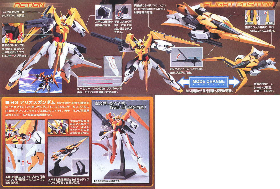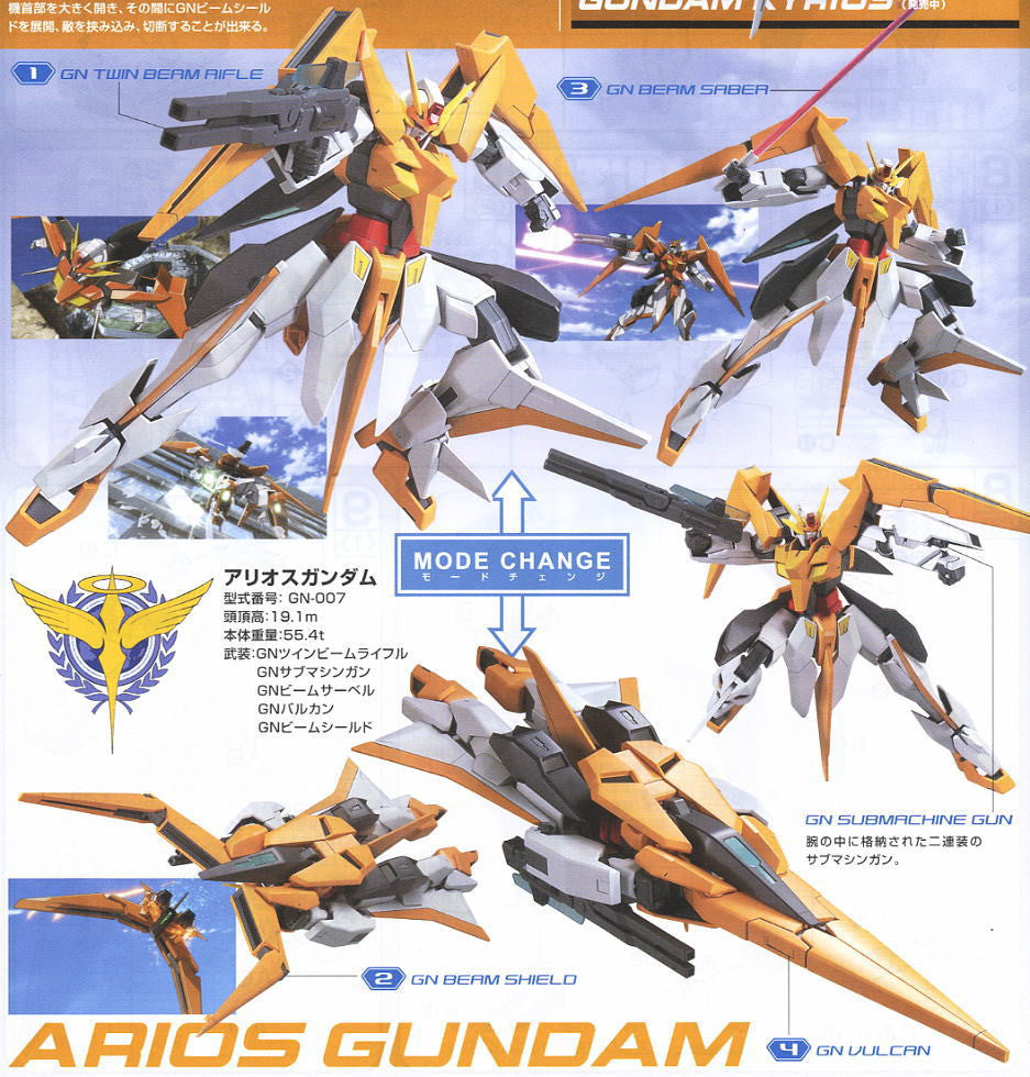 The High-Flying variable mobile suit Arios from Gundam 00's second season is a sharply detailed and fun to build 1/144 scale High Grade. The Arios Gundam comes with all of the weapons seen in the show including the GN Sub Machine Guns located under the wrists, the GN Twin Beam Rifle, GN Beam Shields that can turn into the GN Claw and even a pair of GN Beam Sabers. The Arios can transform into mobile armor mode as well and even comes with a stand to simulate it in flight mode!