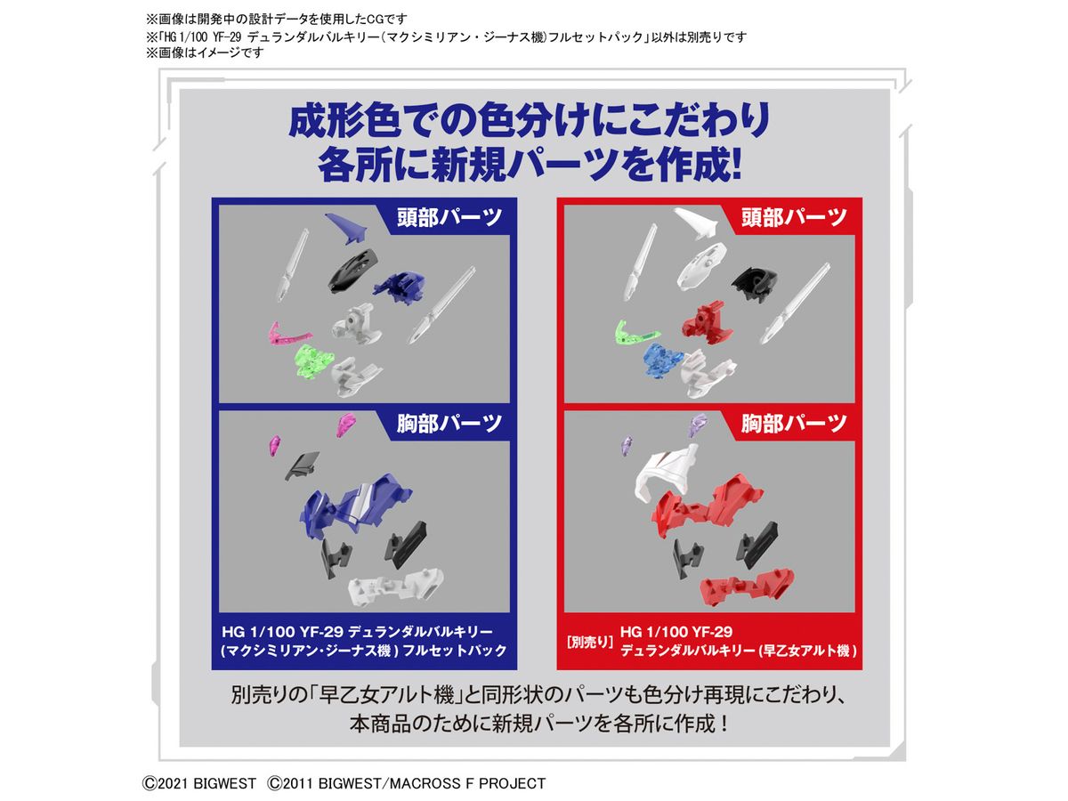 Maximilian Genus's custom YF-29 Durandal Valkyrie, as seen in "Macross Delta Zettai LIVE!!!!!!", is now a full set High Grade (HG) model kit from Bandai complete with super parts! Utilizing the HG series' ease of assembly and wide range of motion, this kit adopts the "Shortcut Change," which simplifies the transformation sequence by using replacement parts. The super parts can be removed and replaced; the development of the missile hatch and fold wave projector is also reproduced by parts replacement. The booster nozzle has a telescopic gimmick; the curved beauty of the forward wings in Fighter Mode are faithfully reproduce, as is the characteristic silhouette in Gerwalk Mode. The Battroid Mode also boasts its typical smart bodyline! The range of motion of the arms has been expanded by giving the shoulders pull-out joints, and a triple-axis joint has been added to the chest too. Its hip joint also has a wide range of motion for dynamic and natural posing. The clear parts are made with polarization molding in three colors that change depending on how the light hits it, too!