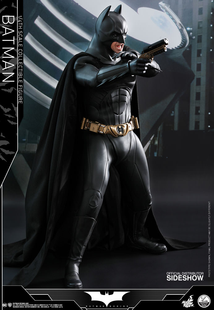 Sideshow and Hot Toys are pleased to officially introduce the quarter scale Batman from????Batman????Begins!????The incredibly detailed Batman collectible figure stands about 47 cm tall. It features a newly developed head sculpt with astonishing likeness of Christian Bale as Bruce Wayne, an alternate Batman head with 3 interchangeable lower faces, meticulously tailored and highly detailed Batsuit, a detachable climbing harness and wearable balaclava, a magnetically attachable cape, an assortments of Batman gadgets and accessories, as well as a specially designed????Batman Begins????themed figure stand.????
